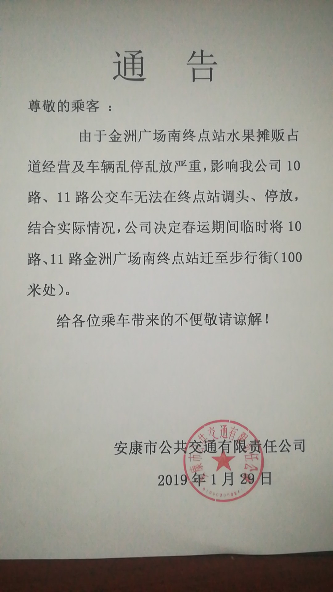 由于金洲廣場南終點站水果攤販占道經營及車輛亂停亂放嚴重,影響我公司10路、11路公交車無法在終點站調頭、停放,結合實際情況,公司決定春運期間臨時將10路、11路金洲廣場南終點站遷至步行街(100米處)。